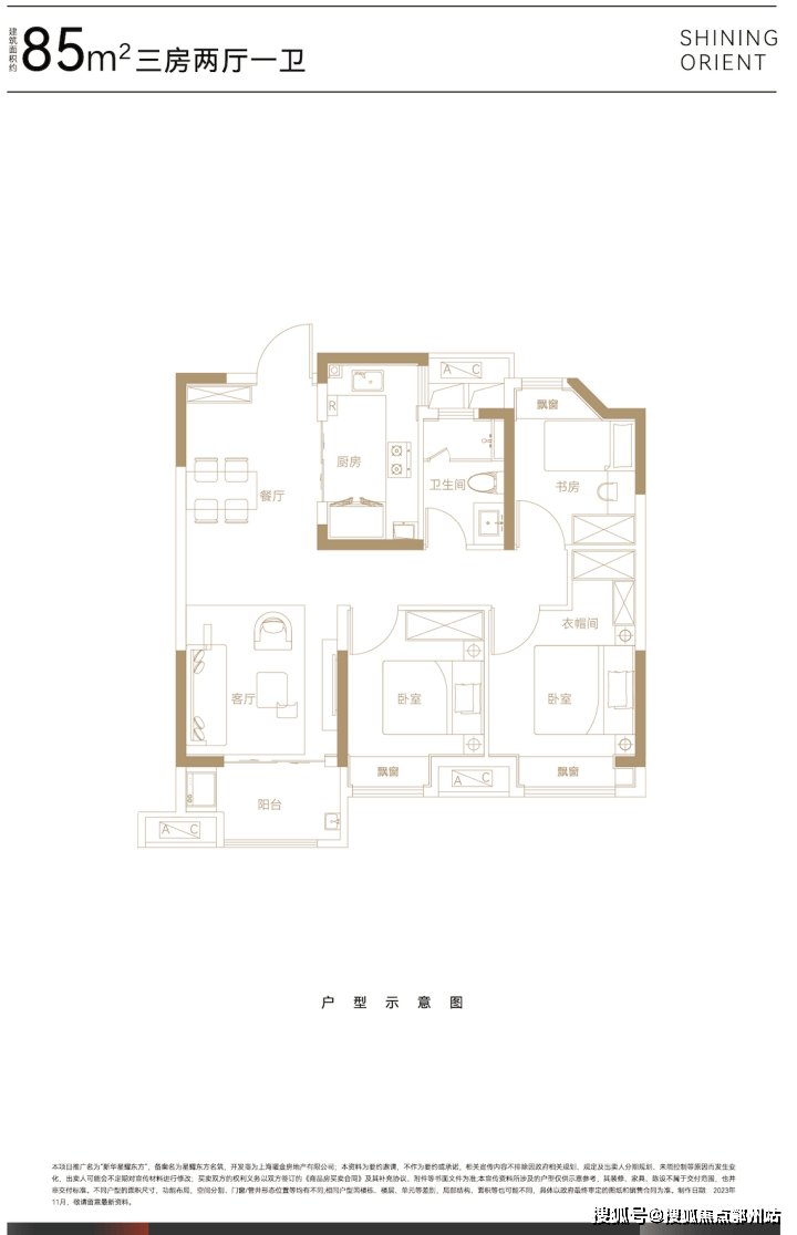 建面约85㎡三房两厅一卫