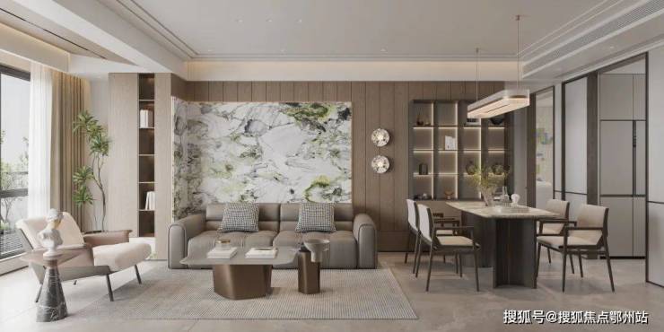餐客厅与观景飘窗相连,延伸居住的宽阔尺度,整合出一个大的开放性空间,轻松承载社交、聚餐、休闲、娱乐多种需求。