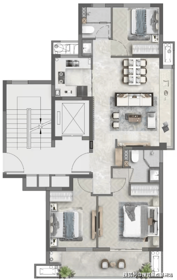 南向三个卧室均带有飘窗或阳台,让每一位家庭成员都能得到阳光照拂。 北向书房可以布局成娱乐房、储藏室或玩具房,将空间赋予更多可能。