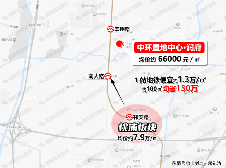 而从地铁沿线来看,项目不仅位于15号线丰翔路地铁上盖,距离南侧南大路站TOD也不到500米,与南大路一站之隔的桃浦新房均价已经直逼8万/㎡,而中环置地中心润府的首开均价仅约6.6万/㎡!