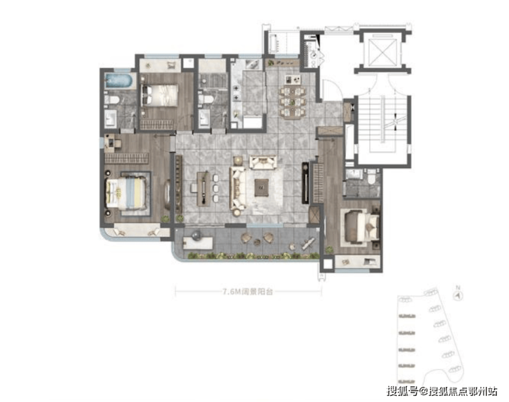 南向四开间,专梯入户,超凡三卫设计;约40㎡超大横厅,IMAX阔境生活;约7.6米阔尺廊台,无界视野体验。