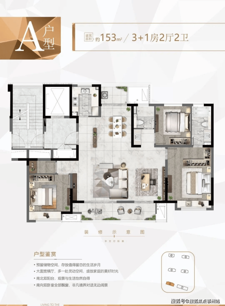 建面约 153㎡户型:四开间朝南,多功能厅增加了家的可能性,朝南双阳台与朝北生活阳台设计,近 8 米宽幕阳台与客厅一体。