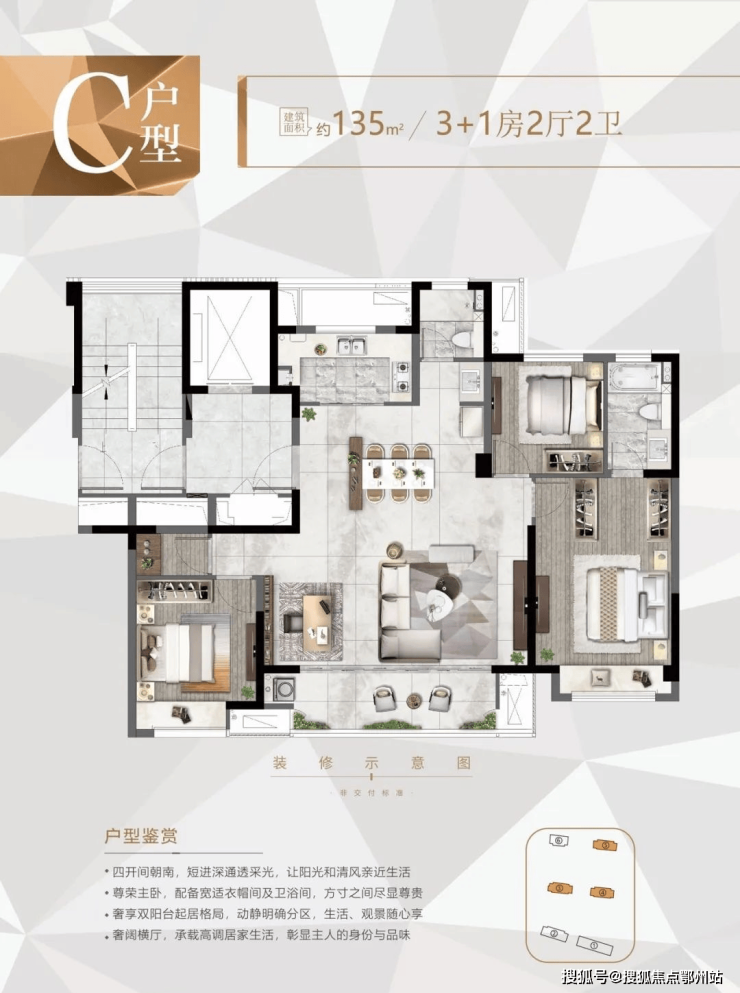 建面约 135㎡户型:有 6.8 米的双景阳台,客厅空间开阔,采光通风佳,南向卧室设计,套房式主卧带步入式衣帽间及独立卫生间。