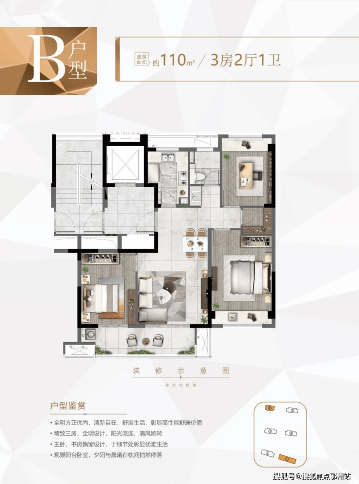 建面约 110㎡户型:三开间朝南带双景观阳台,餐客厅一体连接阳台,通风采光好,还有储藏室便于收纳,卫生间干湿分离。