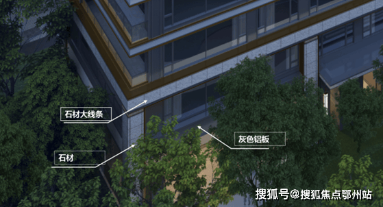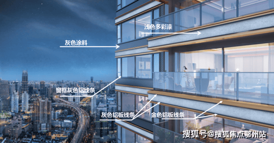 标准层外立面选材以涂料、多彩漆为主,层间以及窗框周边点缀铝板线条进行装饰;石材大线条以下的外立面(架空层和二层)均为石材和铝板(除窗户、阳台内侧墙面、玻璃栏板、百叶外)。