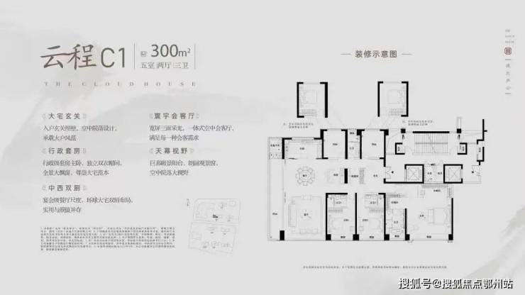 建面约300㎡户型样板间,独立电梯厅,形成入户缓冲区,提升归家隐私,入户门选用钢木装甲门与五合一智能门锁,为安全加码,独立玄关背景墙,打造生活双动线与高拓展收纳柜。五房两厅四卫的布局,实现三套房与中西厨设计,空间尺度与居住舒适度皆具。
