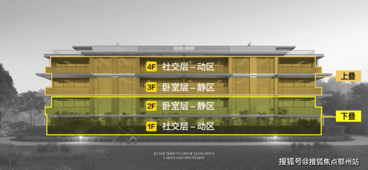 台地高差赋予了建筑更强的层次感,地面花园变成了 “露台式花园”, 而露台则变成了 “空中的私人会所” ,连卧室大落地窗都变成了 “悬浮于林梢的取景框” ,将良渚的自然肌理与人文景致尽收眼底,私密性与视野感双双拉满。