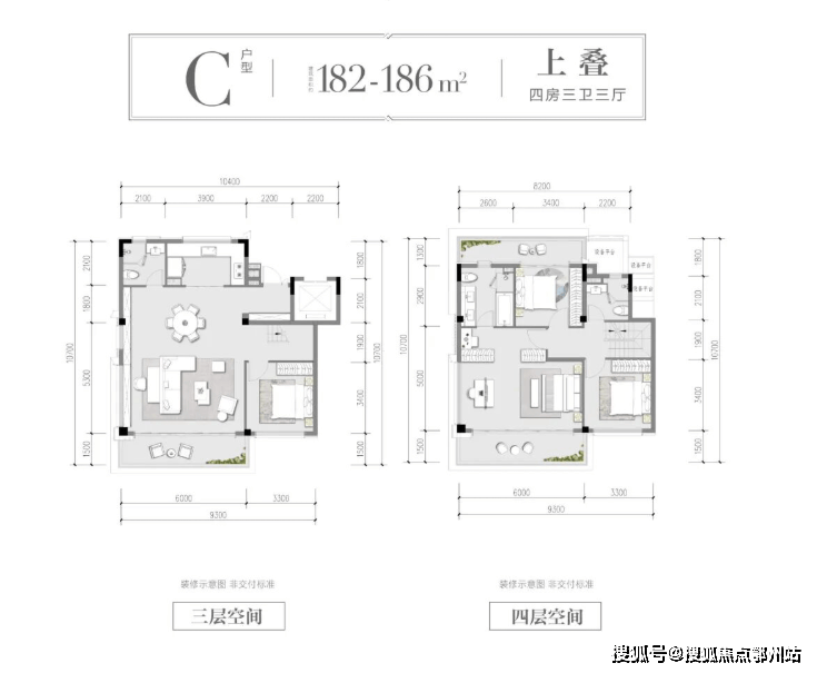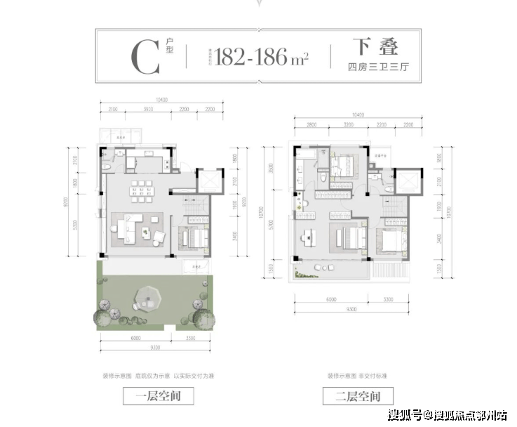 以C户型下叠为例,约18.6m南向大面宽(双层),无界风景延伸入室;270°环幕采光,尽情沐浴暖阳。在珍存的低密土地上