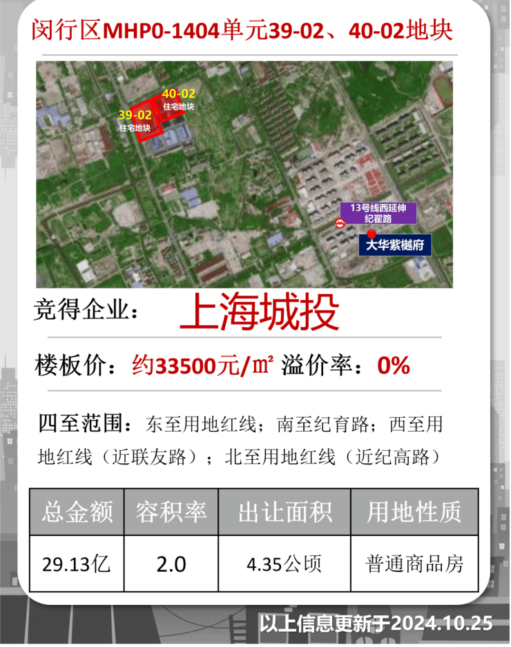 2024年上海六批次土拍中,上海城投以总价约29.13亿元拿下闵行前湾MHP0-1404单元39-02、40-02地块,成交楼板价33500元/㎡。