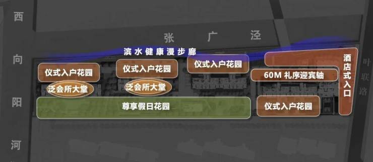 "一口一轴两廊两会所"布局(60米迎宾轴+300米滨水步道)