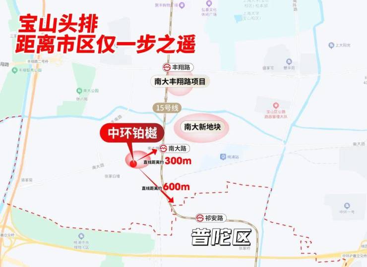 首先,中环铂樾是宝山头排,项目距离普陀直仅约600米,是整个南大乃至整个宝山距离市区最近的一个。