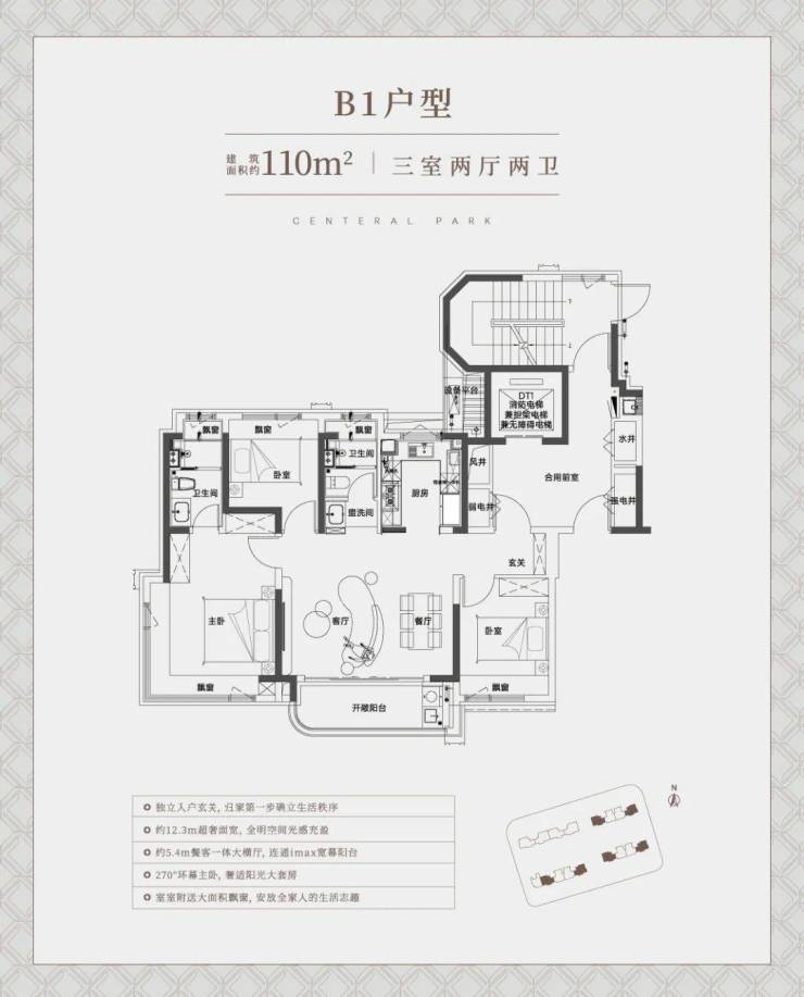 先来看建面约110㎡边套大横厅户型: 约12.3米的超宽绰面宽几乎是堪比别墅产品 了,这个视野和 南向采光面相当出众。