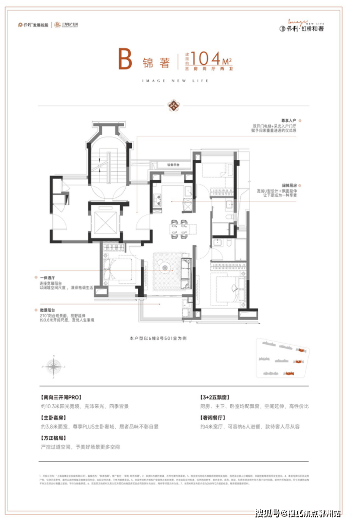 104㎡的舒适三房设计,飞机户型 的空间排布,空间充裕但不浪费,将每一平米更大化利用,家人居住也互不干扰;开放式阳台,南向面宽达 10.3米 ,通风好采光佳;客餐厅空间 足够容纳六人餐桌,主卧套房 则非常奢华舒适,南北三面270°转角飘窗 ,整体科学布局之外,再搭配玄关柜、餐边柜、橱柜、镜柜等多重收纳空间 ,大大提升居住的舒适性,以几百万的价格就能享受到千万级豪宅般的生活体验。除此以外,5大飘窗+宽景阳台+6-8平的入户门厅 这一套组合下来,室内空间大大延伸和拓展,居住的舒适性直接拉满,简直不要太划算!