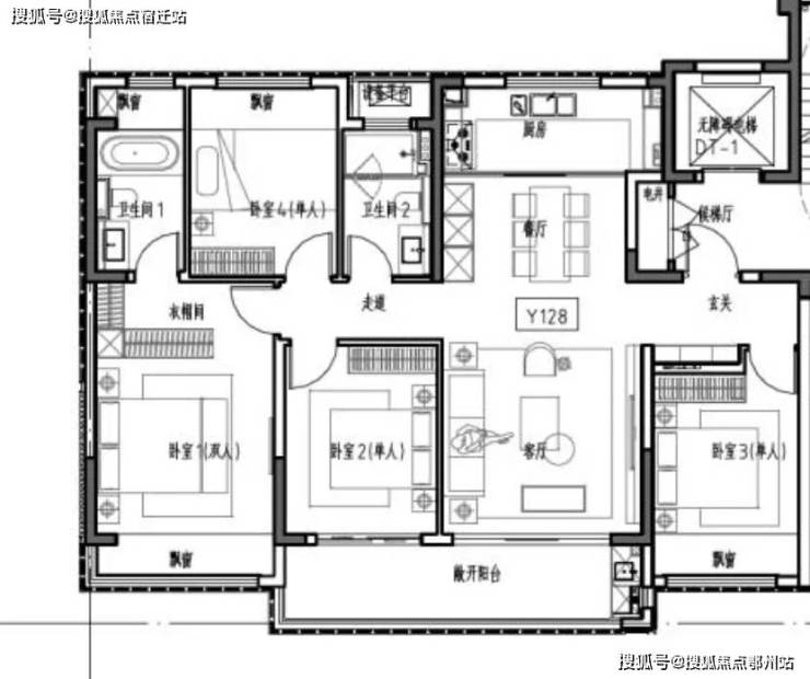 下叠建面约235㎡,4室2厅4卫,三套房设计。这个户型亮点,卧室做了全朝南设计!