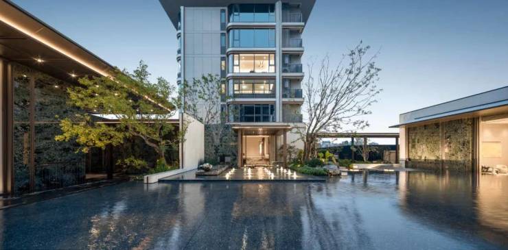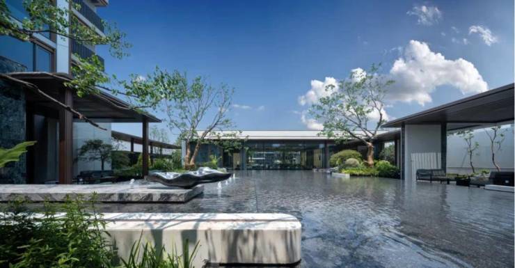 以约70米进深北塘河滨水公园为天然幕布,项目打造了内外双园无界融合的度假式景观。