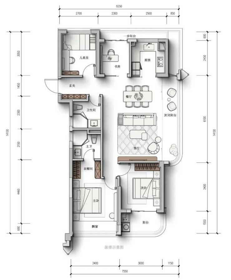 建面约112㎡四房,罕见三阳台设计,LDKB一体化 + 270°环幕视野,直接对标市面125㎡ + 户型。