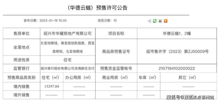 ,越城区人民政府网站发布了华德云樾 1#、2# 楼 的预售许可公告,这也是华德云樾领出的首张预售许可证。