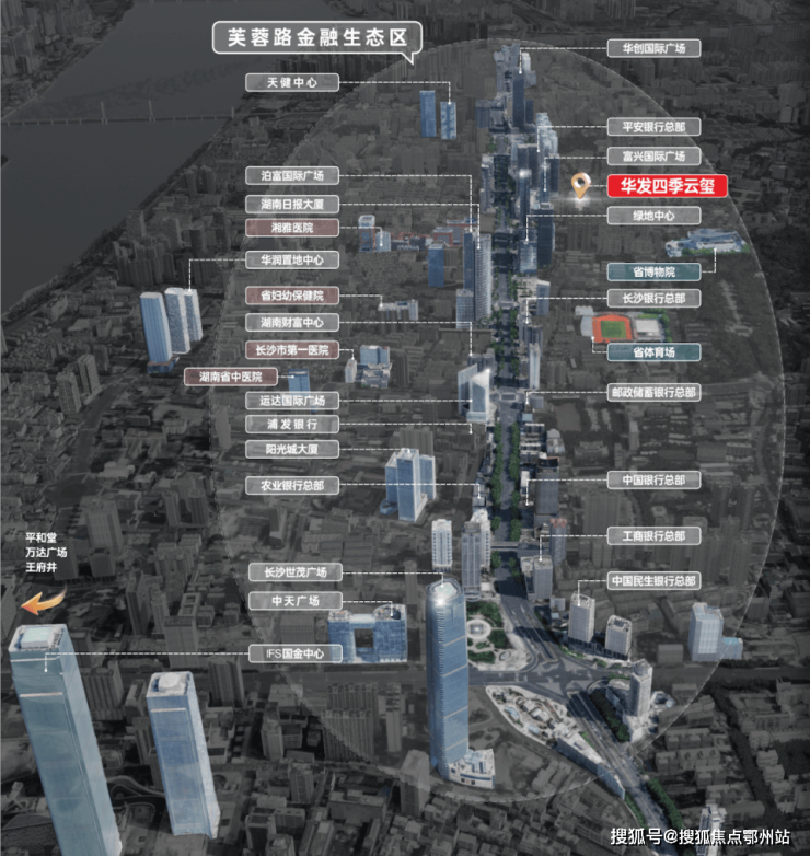 目前芙蓉中路聚集了 全长沙约60%的金融总量,约76.5%的金融业态,涵盖全球战略投资机构37家、全国和省级金融总部59家、全球四大会计事务所3家、200多家银行、70余家证券/基金/保险等金融机构。